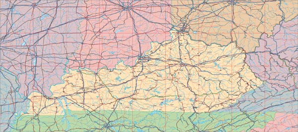 ![]() Detail view of EPS Vector Map of Kentucky - the land fill color is switched on. The EPS Vector map for Kentucky has 26 layers which may be individually modified or removed. Select the Vector only EPS map of Kentucky option to download this style map. |