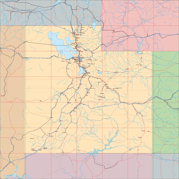 ![]() Detail view of EPS Vector Map of Utah - the land fill color is switched on. The EPS Vector map for Utah has 25 layers which may be individually modified or removed. Select the Vector only EPS map of Utah option to download this style map. |