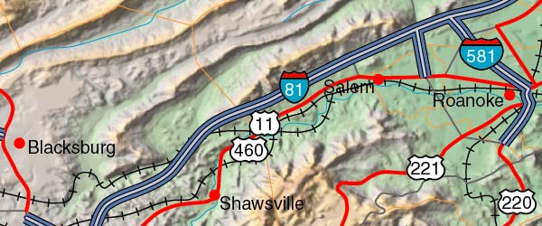 ![]() Detail View of the Cartographic style relief rendering when placed under the Vector EPS map. Any of the 5 relief styles may be used as alternative background textures to customize this map. Contrast of the relief map layer may be dimmed by adjusting the opacity - for Virgini is set to 70%. Select the Relief & EPS Map Package of Virginia option to download this style map collection. |