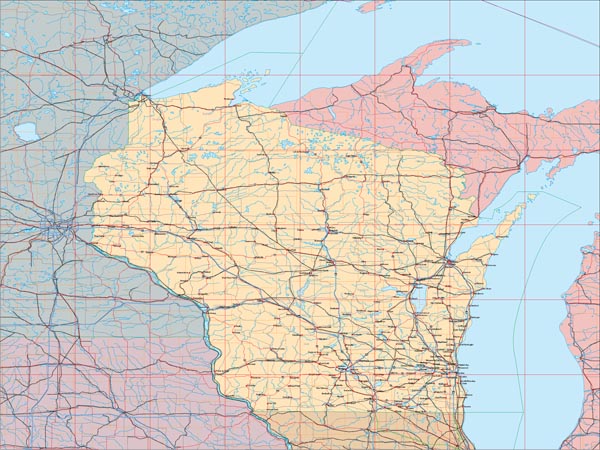 Detail view of EPS Vector Map of Wisconsin - the land fill color is switched on.